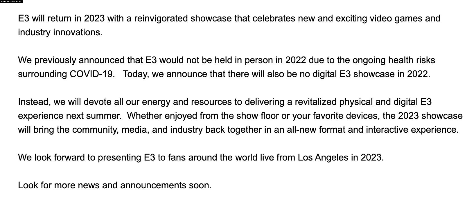Zgodnie z jego treścią targi E3 mają powrócić w 2023 roku w nowej formule – zarówno stacjonarnie, jak i online. Czeka nas ponoć bardziej interaktywne doświadczenie, zrzeszające wszystkich przedstawicieli branży.