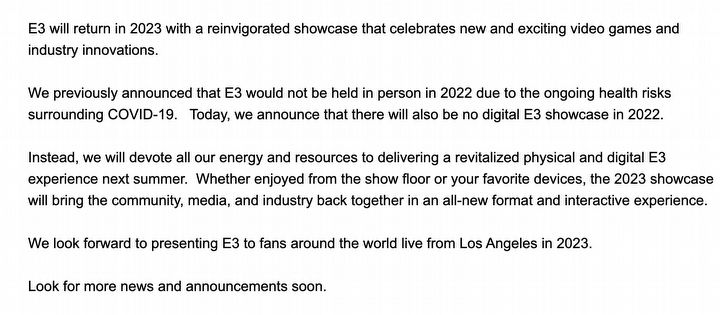 Oficjalnego komunikatu ESA wciąż nie ma, lecz kolejni przedstawiciele branżowych mediów potwierdzają, że E3 2022 nie odbędzie się w żadnej formie. Jeden z nich – Stephen Totilo, dziennikarz growy piszący dla serwisu Axios – opublikował na Twitterze screen, mający prezentować oświadczenie owej organizacji.