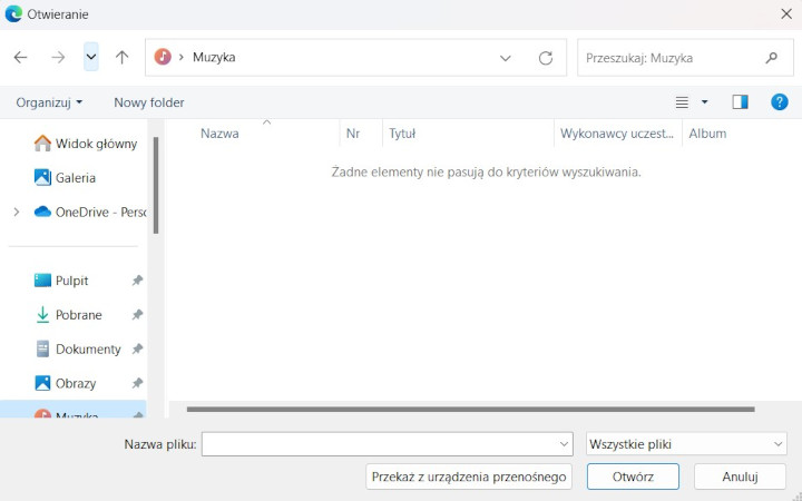 Najpierw musimy rozpocząć proces przesyłania. W klasycznym okienku wyboru interesujących nas plików powinna pojawić się nowa opcja, opisana jako Przekaż z urządzenia przenośnego.