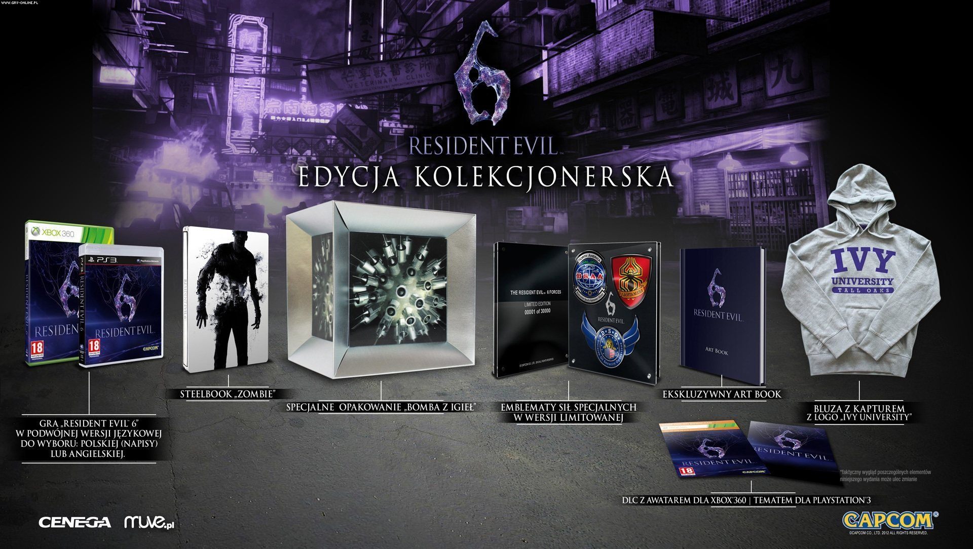 Poznaliśmy szczegóły edycji kolekcjonerskiej gry Resident Evil 6, która zostanie wydana na PlayStation 3 oraz Xbox 360. W skład tego pakietu wejdą takie dodatki jak książeczka z grafikami, bluza z kapturem oraz zestaw emblematów aluminiowych. Cenega Poland poinformowała, że za te i inne dodatki zapłacimy 599,99 złotych - dystrybutor przekonuje, że to najniższa cena w Europie. Zamówienia na Resident Evil 6 można składać już teraz.