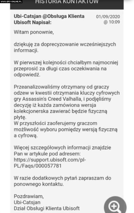 Nieco ponad tydzień temu branżę obiegła wiadomość, że Ubisoft zrezygnował z dodawania fizycznych nośników do edycji kolekcjonerskich ich nadchodzących gier w wersjach na konsole marki Xbox. Zamiast nich w zestawach miały znaleźć się cyfrowe kody, odblokowujące dostęp do produkcji na danej platformie. Jak nietrudno się domyślić, wywołało to spore niezadowolenie wśród miłośników pudełek. Wielu zawiedzionych zaczęło wysyłać maile do francuskiego giganta z prośbą o wyjaśnienie całej sytuacji. W tej grupie był jeden z naszych czytelników, którego interesowała przede wszystkim kwestia Assassin's Creed: Valhalla. Oto, co otrzymał w odpowiedzi.