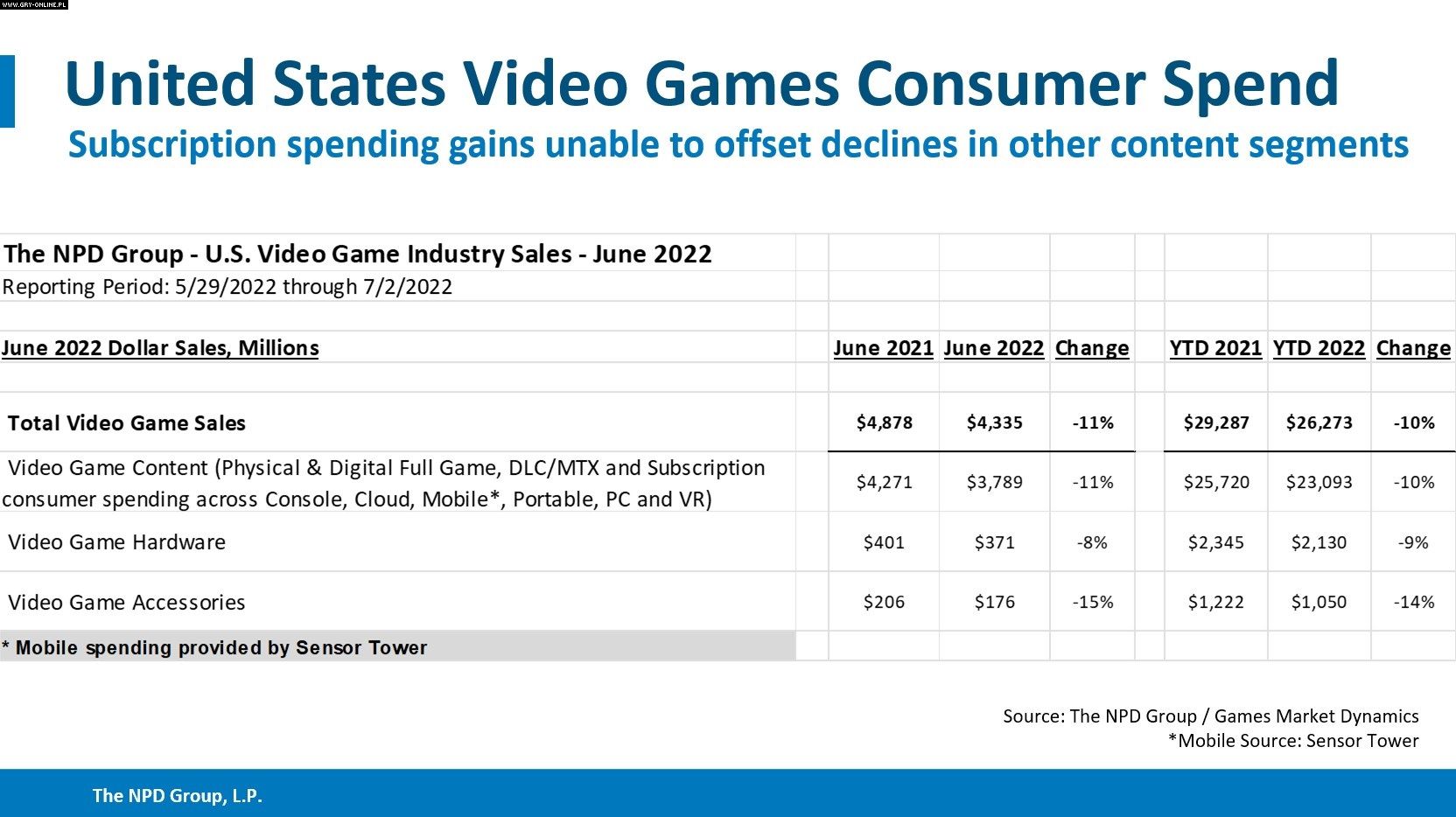 Ponadto interesujący wydaje się wzrost wydatków na growe subskrypcje – takie jak PC/Xbox Game Pass czy PS Plus – przy jednoczesnym spadku pieniędzy inwestowanych w konsole. Suma tych ostatnich zmniejszyła się w czerwcu 2022 roku o 9% względem czerwca 2021 r. i wyniosła 2,1 mld dolarów – czyli niemal połowę wspomnianej wyżej kwoty 4,3 mld dolarów.
