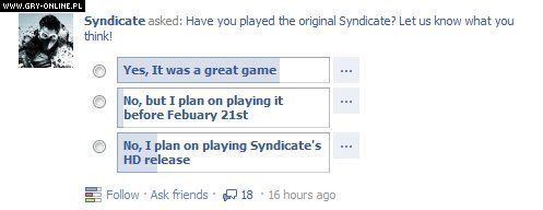 Pytanie w internetowej ankiecie brzmi następująco: „Czy graliście w oryginalnego Syndicate?”. Pierwsze dwie odpowiedzi nie są zbytnio zaskakujące: „Tak, to była świetna gra” i „Nie, ale zamierzam zagrać przed lutym 2012 roku [przed premierą nowej odsłony – dop. redakcji]”. Najbardziej interesująca jednak jest trzecia opcja, w której możemy zaznaczyć „Nie, planuję zagrać w Syndicate w wersji HD”.