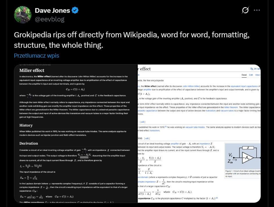 Grokipedia od początku budziła mieszane uczucia wśród internautów. Póki co serwis funkcjonuje w wersji 0.1, ale znajduje się na nim 885 279 artykułów wyłącznie w języku angielskim na różne tematy – od motoryzacji, po rozbudowany życiorys Elona Muska. Obecna wersja witryny nie obsługuje jednak obrazków i prezentuje jedynie ściany tekstu. Tyle że niektóre artykuły wydają się dziwnie znajome, a niektóre źródła do nich niekoniecznie rzetelne.