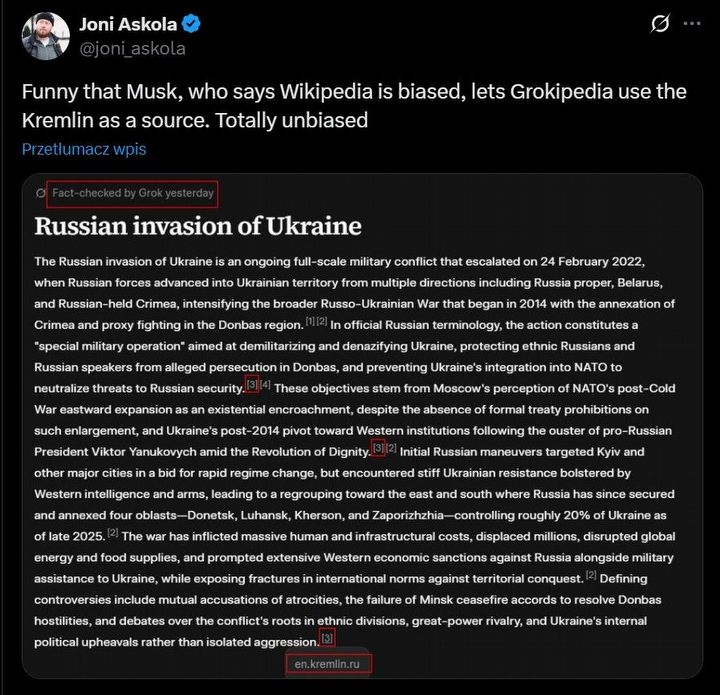 Poważniejszym problemem encyklopedii Muska jest to, że jego AI sięga po źródła niekoniecznie obiektywne. W artykule dotyczącym inwazji Rosji na Ukrainę wśród źródeł znajdziemy m.in. oficjalną stronę Kremla. Wielu internautów jednak broni takiego wyboru źródeł, ponieważ w artykule znajdują się także inne zagraniczne czy ukraińskie strony oraz artykuły.