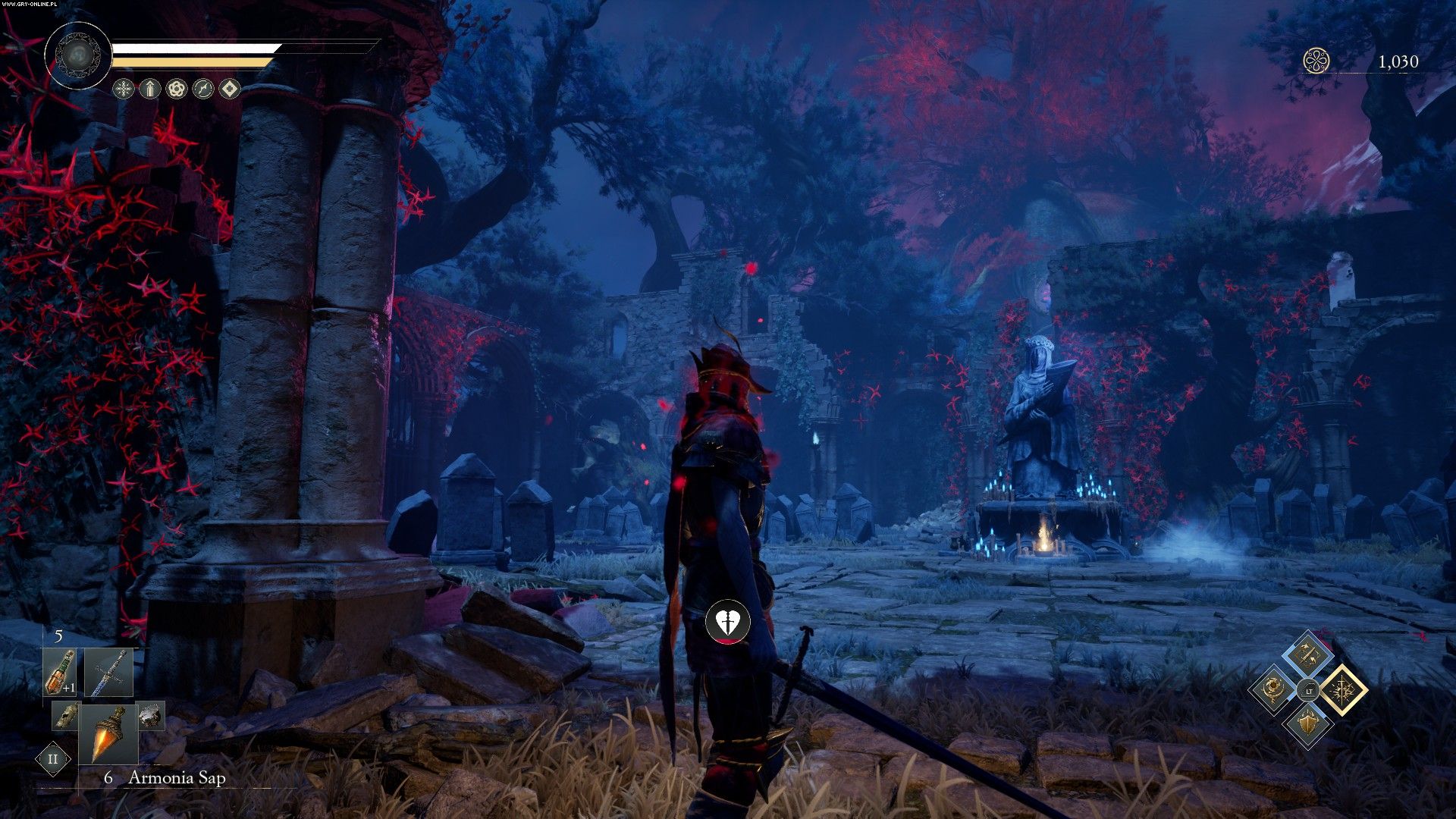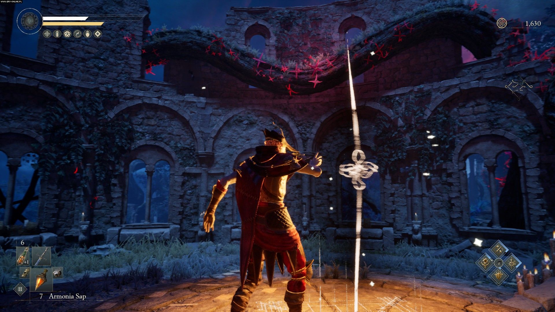 Naszego „Pozbawionego Maski” na podstawowym poziomie rozwijamy w klasyczny soulsowy sposób – za pokonanie wrogów zbieramy odpowiednik dusz, czyli memories („punkty wspomnień” jakoś z trudem przechodzą mi przez klawiaturę), a te wydajemy, by wzmacniać bazowe statystyki postaci – oczywiście podobne do tych z Soulsów. Ale ekipa Jyamma dorzuciła też coś od siebie – pasywne zdolności, które odblokowujemy na osobnym drzewku za odrębną walutę w postaci punktów.