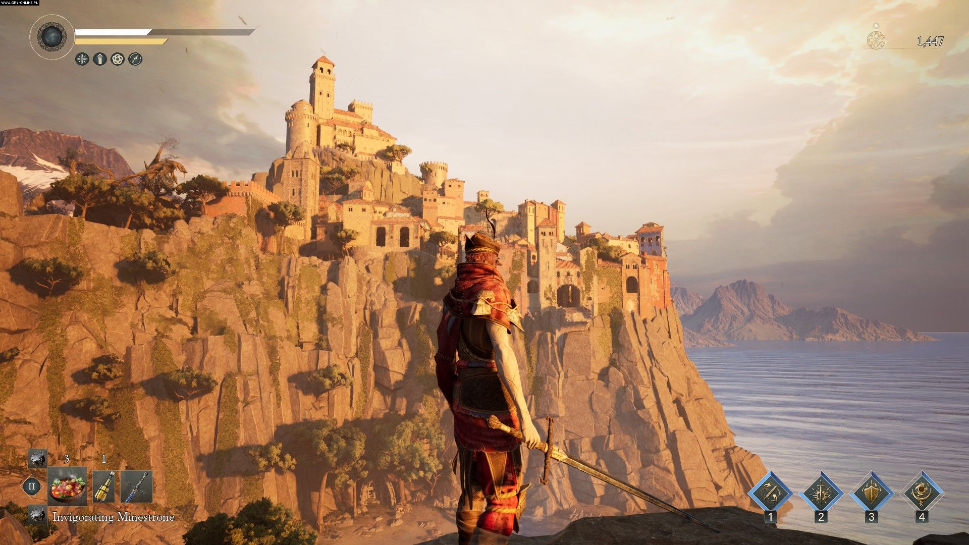 To, co Enotrię wyróżnia, to oprawa artystyczna. Zamiast gotyku, lovecraftowskiej nowożytności samurajów w wydaniu Kurosawy (Sekiro) lub anime (NiOh) przebiegniemy się po krainie inspirowanej włoskim średniowieczem, renesansem i folklorem wprost ze słonecznego półwyspu. Zapomnijcie o zakutych w blachy rycerzach i zakapturzonych magach. To świat niepokojący, ale przez dziwność ogólnych zasad, a nie kolor każdego piksela. Kroczymy przez skąpane w blasku dnia miasteczka, plaże, góry – ostatni biom jest trochę mroczniejszy, ale wciąż przypomina ogród lub winnicę z renesansowego romansu wykrzywionego baśniową dziwnością.