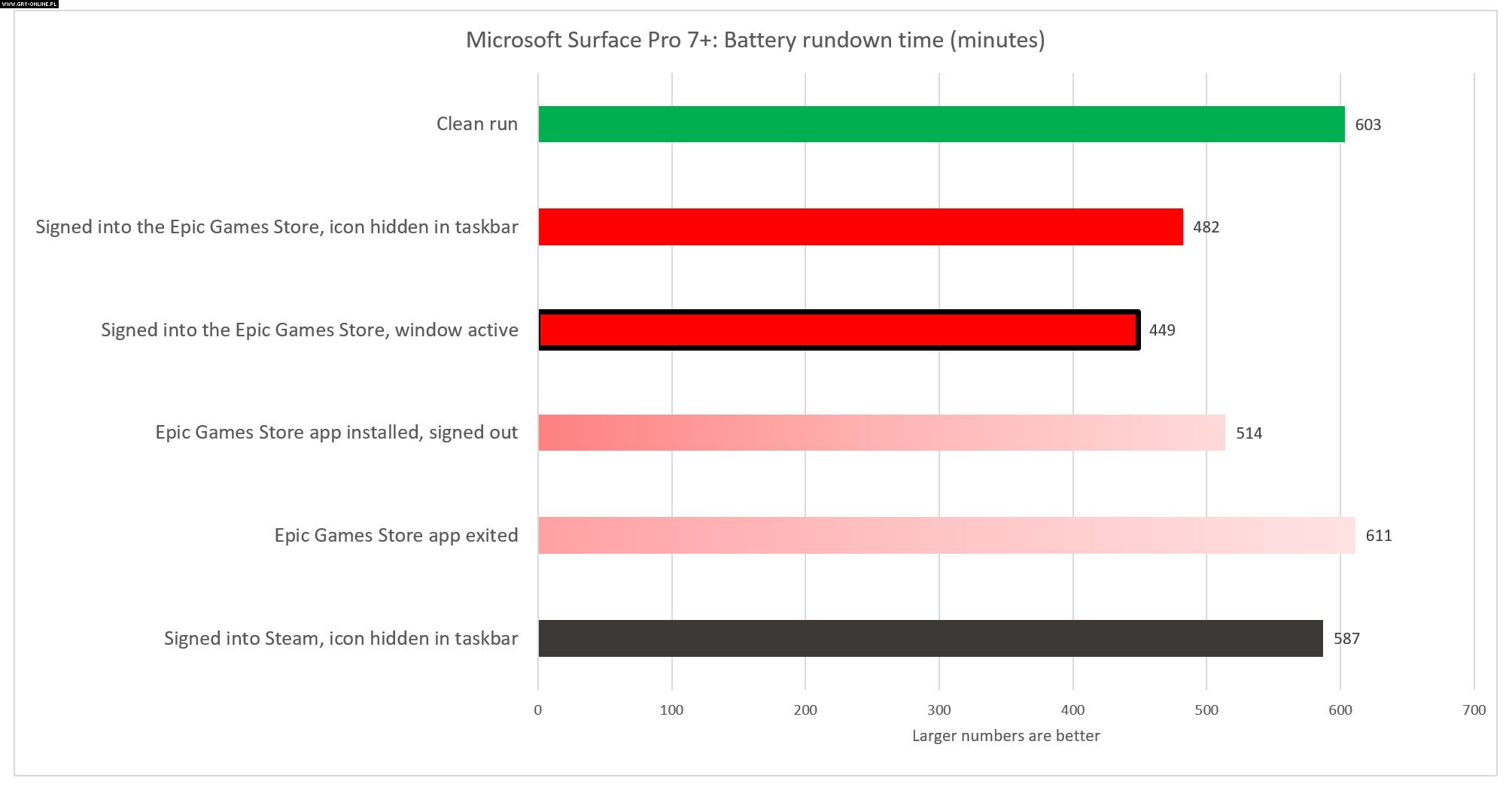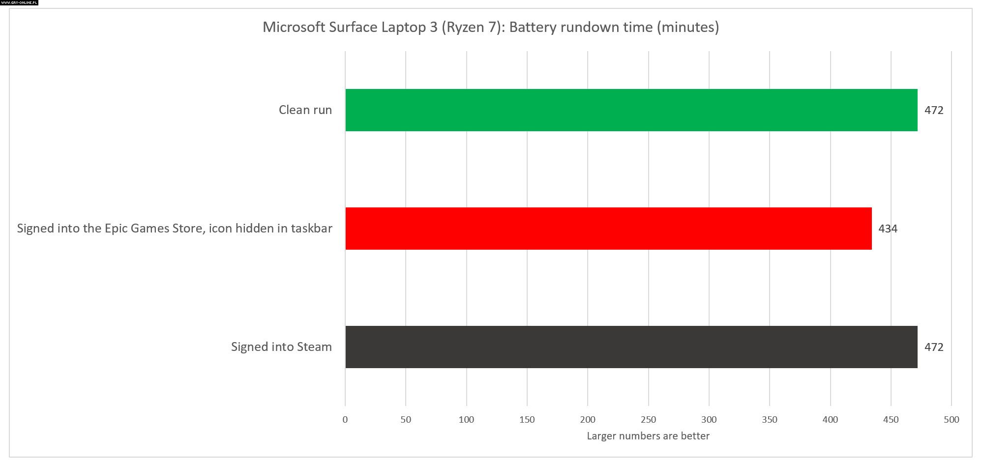 Microsoft Surface Laptop 3 radził sobie z aplikacją lepiej, ale również odczuł jej wpływ. W tym przypadku spadek żywotności wynosił 38 minut. Różnica pomiędzy laptopem a tabletem jest więc znacząca. Warto jednak wspomnieć, że w obu przypadkach redakcja PCWorld sprawdziła także jak na czas działania wpływa Steam. Okazało się, że platforma Valve w żadnym stopniu nie zmniejsza żywotności baterii. Dziennikarze wysłali wyniki testów do samej firmy odpowiedzialnej za aplikację. Wygląda więc na to, że Epic Games Store czekają kolejne poprawki.