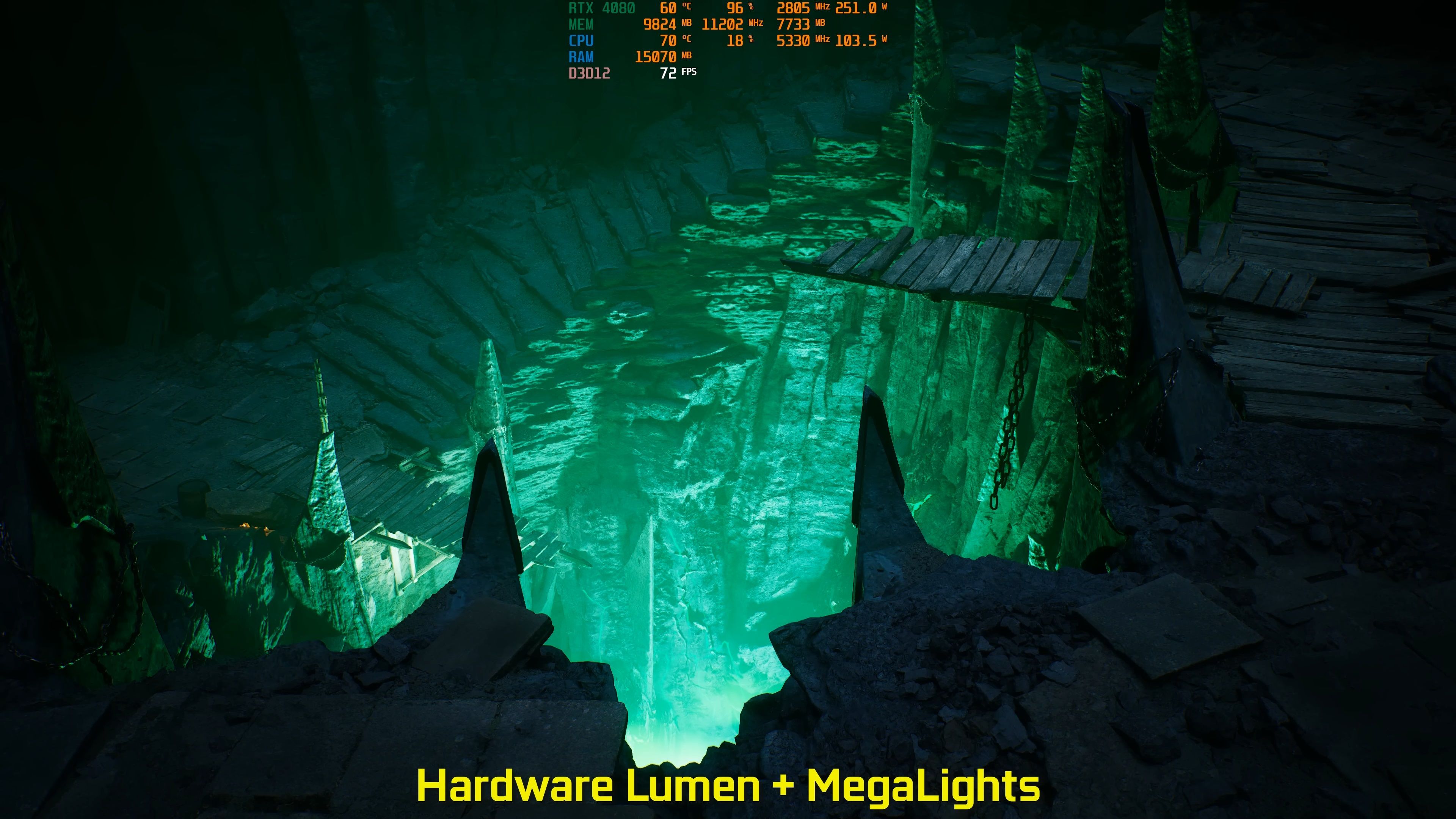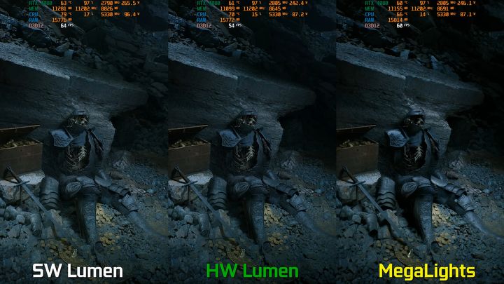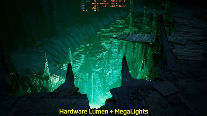 MegaLights, nazywane przez niektórych „Nanite dla oświetlenia”, pozwala deweloperom na dodanie setek dynamicznych źródeł światła bez obawy o spadek wydajności. Co więcej, testy przeprowadzone przez twórców na kanale „MxBenchmarkPC” wykazały, że MegaLights może zwiększyć liczbę klatek na sekundę nawet o 67% w scenach z dużą ilością świateł, jednocześnie poprawiając realizm obrazu.