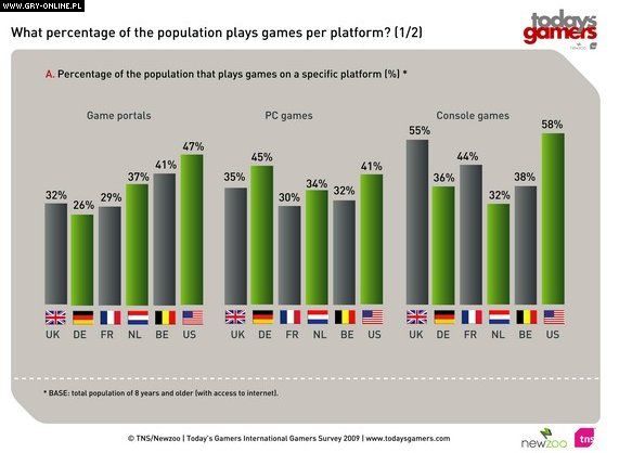Portale z grami internetowymi zyskują na znaczeniu. W Niemczech korzystanie z nich w 2009 roku zadeklarowało 35% mężczyzn i 46% kobiet. U naszych zachodnich sąsiadów najważniejszą platformą pozostaje jednak pecet, z którego korzysta 73% mężczyzn i 66% kobiet. Drugie miejsce przypadło konsolom, obecnym w życiu ponad połowy badanych mieszkańców.