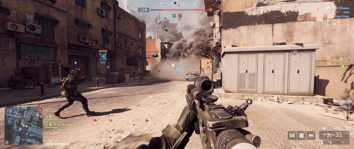 Kolejny element, który przeszedł ewolucję, to poruszanie się żołnierza na polu walki. Na pierwszy rzut oka może się wydawać, że zaszły tu duże zmiany, że zgodnie z obecnymi trendami nasza postać wypada bardzo dynamicznie, wręcz nierealistycznie, ale tak naprawdę parametry szybkości nie odbiegają od tych z Battlefielda 4. Zmieniły się – a raczej znacznie poprawiły – wszelkie animacje, zwłaszcza pokonywania przeszkód, wspinania się, wślizgów, lądowań po skokach i upadkach, przechodzenia ze sprintu do chodzenia, skoku i wślizgu. Dodano do tego liczne ulepszenia i nowe możliwości w postaci szybkiego oparcia broni, wyjrzenia zza zasłony oraz chwytania się elementów pojazdu do szybkiej podwózki.