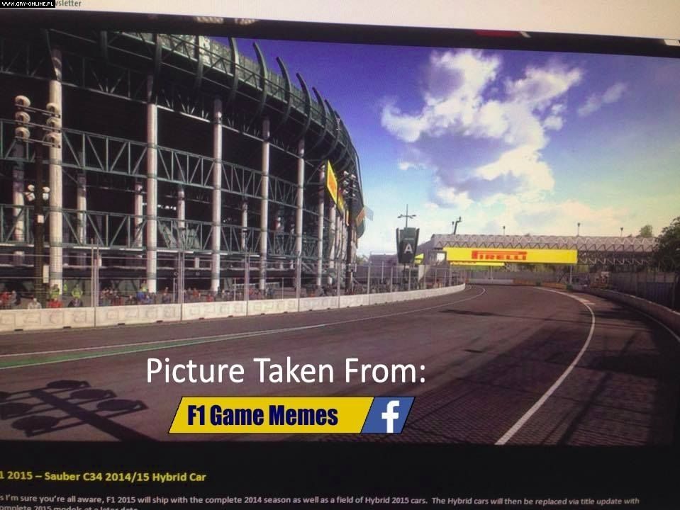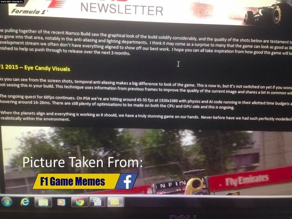 Do sieci wyciekły pierwsze materiały z F1 2015, którą tworzy brytyjskie studio Codemasters Software. Pierwotnie wyciek opublikowano na Facebooku, na profilu F1 Game memes, lecz niemal natychmiast usunięto go na prośbę firmy. W internecie nic jednak nie ginie i udało się zachować zdjęcia, z których możemy wyczytać kilka ciekawych informacji. Przede wszystkim twórcy starają się osiągnąć liczbę 60 FPS-ów oraz udoskonalić stronę wizualną tytułu. Na razie F1 2015 działa w 45-55 klatkach na sekundę na konsoli PlayStation 4 w rozdzielczości 1920x1080. Jeżeli chodzi o warstwę graficzną, to ulepszenia dotknęły głównie kwestii anty-aliasingu oraz systemu oświetlenia. Tytuł trafi na półki sklepowe najprawdopodobniej w lecie i będzie zawierał miks bolidów z 2014 roku oraz pojazdy z 2015 roku. Później, za sprawą patcha, zastąpią je poprawione wersje, gdy ogłoszone zostaną pełne dane o bolidach na nowy sezon. Poniżej prezentujemy wam kilka z opublikowanych zdjęć.