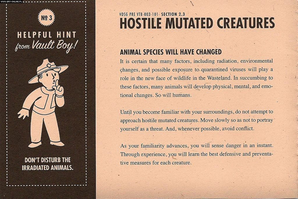 Zupełnie odrębną sprawą jest przedstawiony na PAX 2008 (Penny Arcade Expo) mini-poradnik przetrwania, reklamujący nową odsłonę post-nuklearnego świata. Zawiera on 50 stron, przez które prowadzi nas sam charakterystyczny Vault Boy, oferujący niezwykle błyskotliwe porady. Ponadto na zawartość składają się opisy rozmaitych broni, potworów oraz zagrożeń jakie czyhają poza schronem. Do tego otrzymujemy podręczną mapę. Wszystko zrealizowane w charakterystyczny dla serii sposób – z dużym poczuciem humoru i utrzymaniem konwencji prawdziwej publikacji.