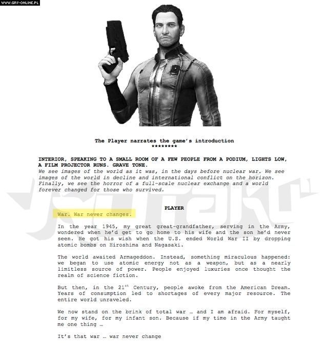 „Wojna. Wojna się nie zmienia” – te kultowe słowa, rozpoczynające każdą odsłonę cyklu, pojawiają się i tutaj. Kojarzymy je z niskim głosem Rona Perlmana. Tym razem, jeśli wierzyć dokumentom, wypowiadałaby je postać gracza – kobieta lub mężczyzna. Gdyby studio Bethesda Softworks faktycznie zdecydowało się na udźwiękowienie kwestii wypowiadanych przez gracza, byłby to precedens w historii firmy. Nowa generacja zobowiązuje, prawda?