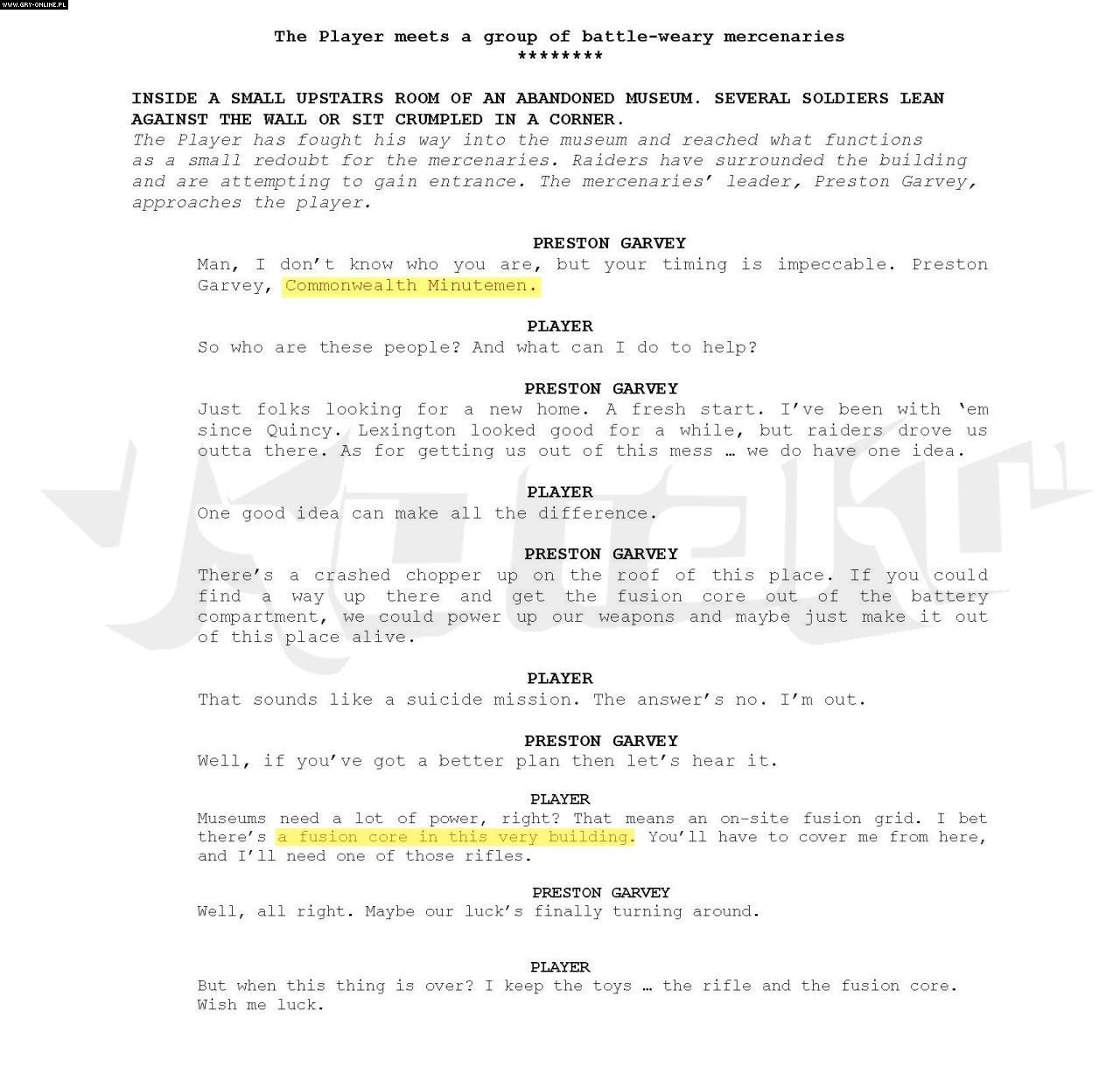 Akcja produkcji miałaby rozgrywać się w Bostonie, o czym plotkowano już wcześniej. We wspomnianych dokumentach pojawia się nazwa Commonwealth, oznaczająca zrujnowany wojną nuklearną stan Massachusetts. Kotaku pisze również o wzmiankach na temat DJ-a radiowego o imieniu Travis Miles, inżyniera Sturgesa oraz dowódcy oddziału Prestona Garveya (zleca graczowi misję w dialogu widocznym powyżej). Z kolei na początku gry główny bohater miałby wybudzić się z hibernacji.