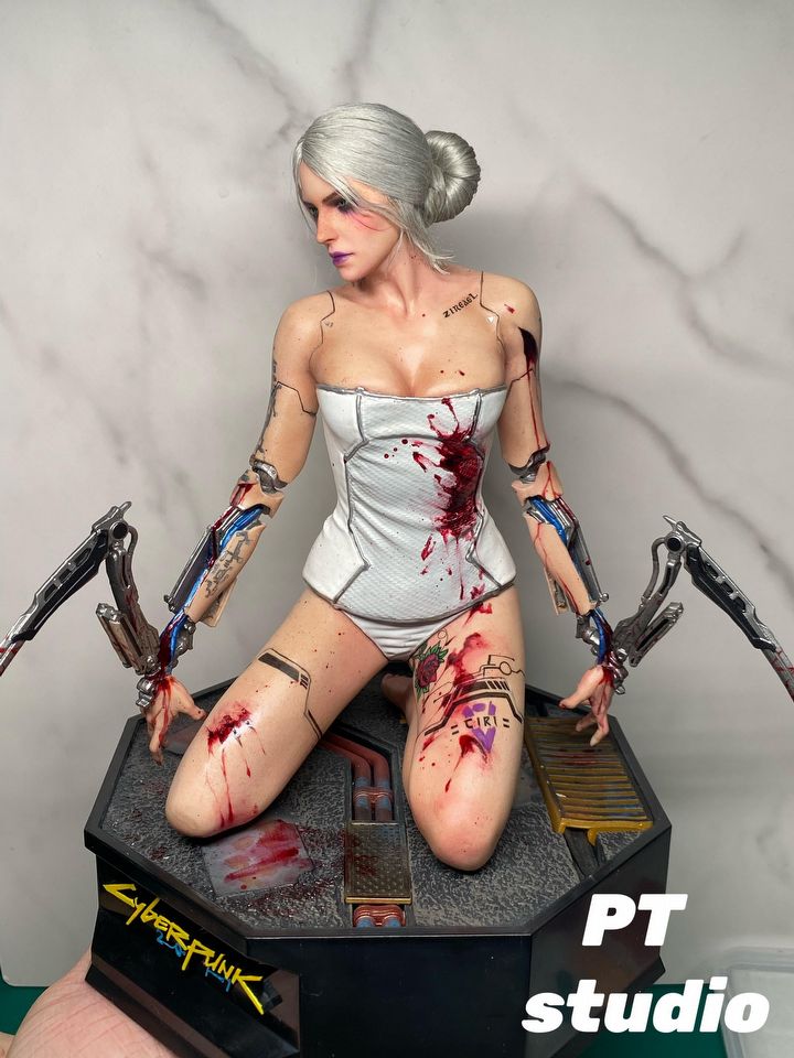 Jak widać, z oryginalnej figurki pozostało niewiele, głównie poza postaci. Artysta pokusił się nie tylko o zmianę wyglądu skóry na nieco realniejszy, ale również na podmianę głowy postaci (na taką, którą wykonał sam). Dzięki temu zamiast kobiety znanej z pierwszego teasera gry statuetka przedstawia cyberpunkową wersję Ciri, która uzbrojona jest w śmiercionośne modliszkowe ostrza.