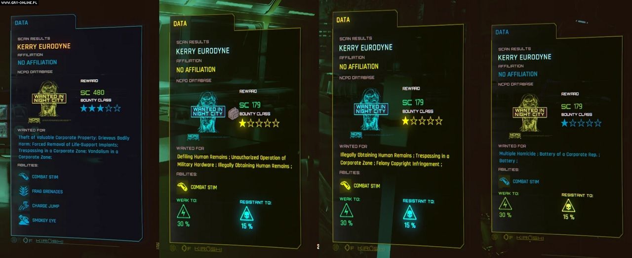 Podczas eksplorowania miasta i wykonywania misji, gracz może skanować napotkanych NPC-ów i zajrzeć przy okazji do ich kartoteki. Przed czujnym okiem Kiroshi nie ukryją się nawet bliscy przyjaciele V, mający swoje za uszami. Czasami są to drobne wykroczenia, a niekiedy poważniejsze przestępstwa.