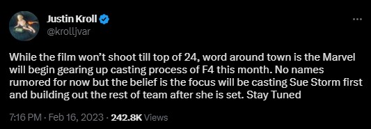 Chociaż film nie zostanie nakręcony przed 2024 rokiem, krążą plotki, że Marvel rozpocznie przygotowania do castingu F4 w tym miesiącu. Na razie nie ma informacji o nazwiskach, ale wierzymy, że skupią się w pierwszej kolejności na obsadzeniu Sue Storm, a dopiero potem na reszcie zespołu. Czekajcie na dalsze informacje – brzmi treść Tweeta.