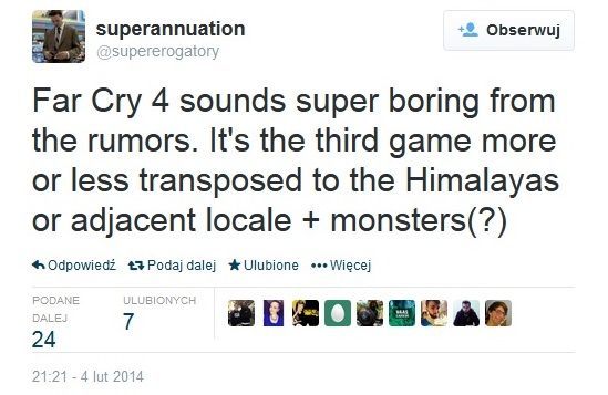 Choć pomysł na umieszczenie w grze potworów dla wielu może się wydawać szokujący, nie byłby to precedens dla serii. Pierwszy Far Cry również pozwalał zmierzyć się z mutantami – dopiero dwie kolejne odsłony odeszły od tego typu przeciwników na rzecz większego realizmu. Z kolei osadzenie akcji w Himalajach byłoby miłą odmianą dla tropikalnych wysp i afrykańskiej dżungli. Czyżby szykował się Skyrim z bronią palną? Jakkolwiek kusząca byłaby to wizja, warto trzymać fantazję na wodzy, jako że powyższe informacje nie są póki co niczym więcej niż plotkami.