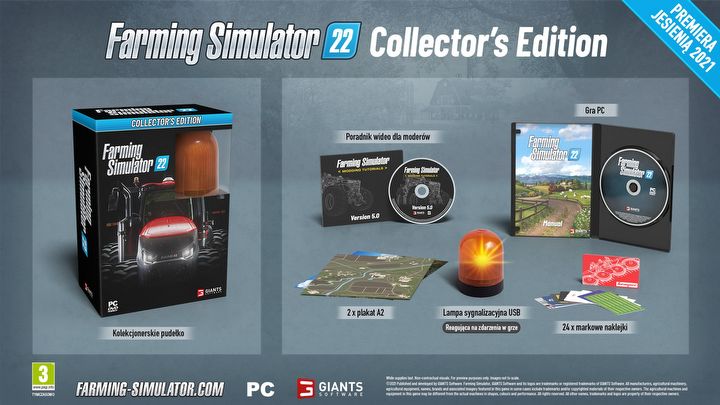Twórcy Farming Simulator 22 nie podali jeszcze daty premiery swojego nowego dzieła, ale nie omieszkali pochwalić się czym innym. Studio GIANTS Software ujawniło edycję kolekcjonerską tytułu. Uwzględni ona dwa plakaty, 24 naklejki oraz lampę sygnalizacyjną z łączem USB, jak również poradnik wideo dla modderów. Wszystko to wraz z mieszczącym całość pudełkiem możecie zobaczyć na poniższej grafice, udostępnionej przez deweloperów.