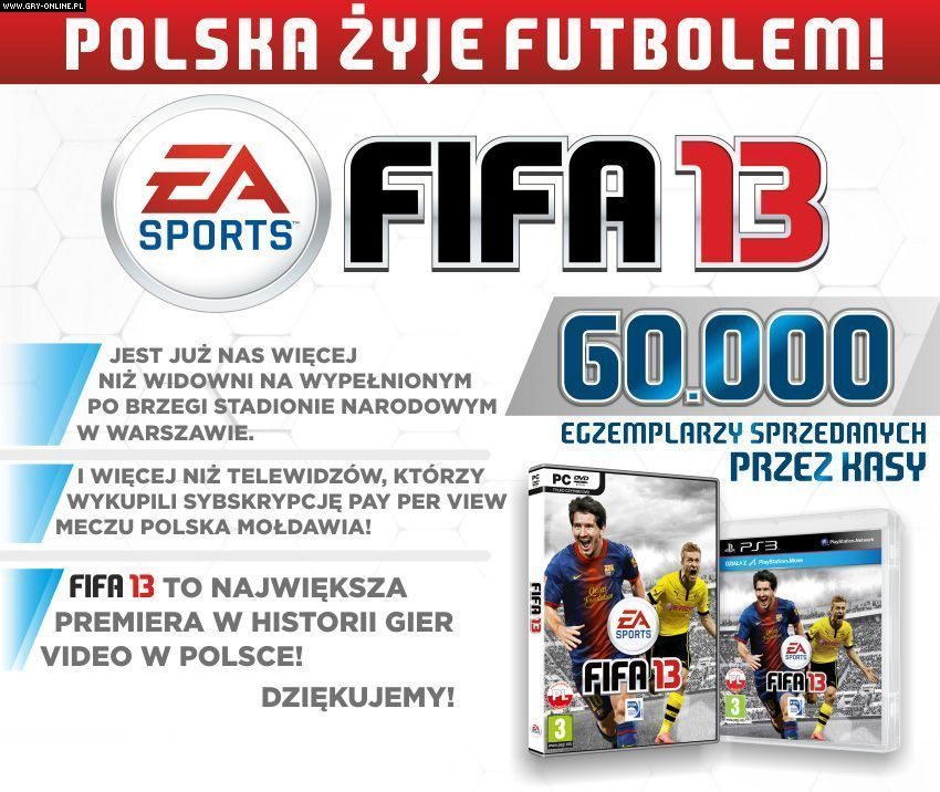 Firma Electronic Arts Polska ujawniła, że do 1 października w naszym kraju sprzedano 60 tysięcy egzemplarzy produkcji sportowej FIFA 13. Według danych dystrybutora, jest to rekordowe osiągnięcie na rodzimym rynku gier wideo.