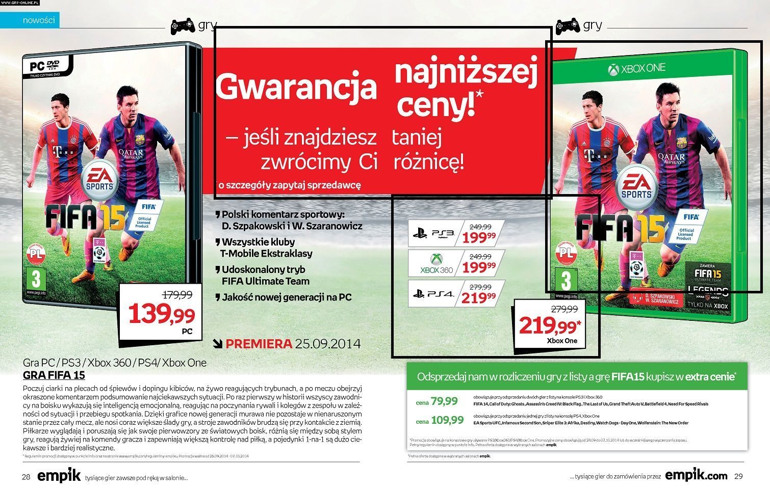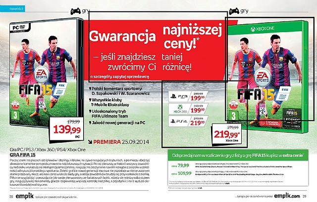 Sieć sklepów Empik rzuca wyzwanie konkurencji oferując atrakcyjną cenę na grę FIFA 15 – wersja PC kosztuje tam 139,99 zł (cena sugerowana: 179,99 zł), PS4/XONE 219,99 zł (cena sugerowana: 279,99 zł), a PS3/X360 199,99 zł (cena sugerowana: 249,99 zł). Empik zobowiązuje się zwrócić różnicę, jeśli uda Wam się znaleźć niższą cenę w innym sklepie. Warto też zwrócić uwagę na promocję z grami używanymi, w ramach której można otrzymać FIFA 15 znacznie taniej. Szczegóły znajdziecie w gazetce: