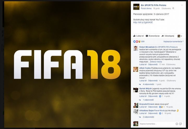 10 czerwca o godzinie 21:00 czasu polskiego odbędzie się konferencja EA Play. Sądziliśmy, że wszystkie najważniejsze projekty firmy Electronic Arts zostaną oficjalnie zapowiedziane właśnie wtedy, ale ostatnio pokazano pierwszy zwiastun Need for Speed: Payback, a dziś doczekamy się prezentacji gry FIFA 18, o czym poinformowano na Facebooku. „Elektronicy” najpewniej nie odkryją wszystkich kart i zapewne pokażą tylko krótki zwiastun oraz być może zdradzą pierwsze szczegóły, a całej reszty doczekamy się podczas wspomnianej na początku konferencji. Nie wiemy jeszcze, o której godzinie odbędzie się zapowiedź produkcji, ale wiadomo za to, że obejrzymy ją na kanale EA Sports w serwisie YouTube.