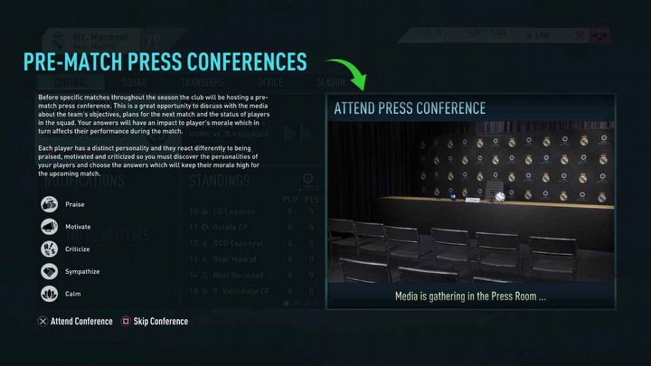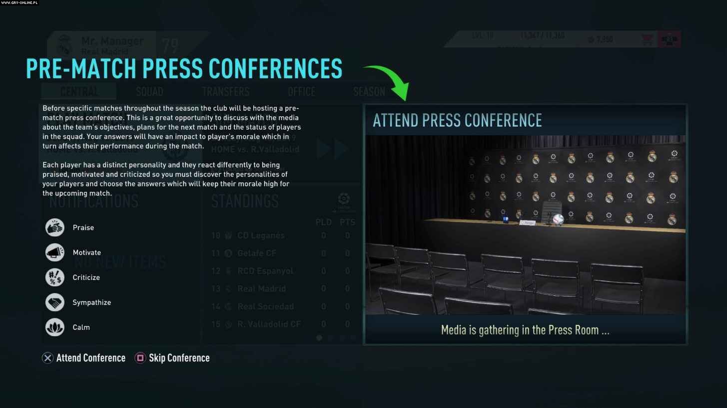 Ok, zanim powiecie, że konferencje prasowe były obecne już w kilku ostatnich odsłonach, pozwólcie mi wyjaśnić. Tym razem nie ograniczą się one jedynie do wyboru między opcjami: motywuj, pochwal, prowokuj (oraz tego, do kogo kierujemy naszą wypowiedź). Odpowiedzi wpłyną na morale naszej drużyny. Jak to będzie wyglądać w praktyce? Bardzo prosto - gramy Realem, przed meczem chwalimy Hazarda (prawdopodobnie za to, że do początku sezonu schudł), a ten na Santiago Bernabeu daje popis swoich umiejętności.