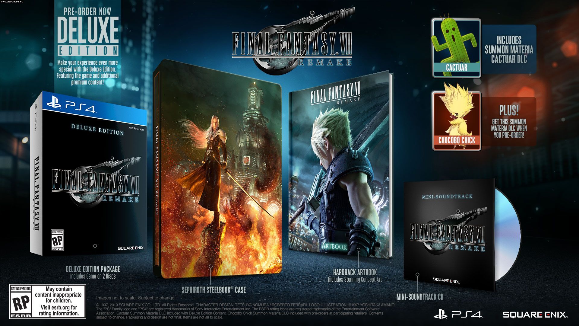 W zamian otrzymamy bogato ilustrowany artbook, płytę CD z muzyką z gry, steelbook ozdobiony klimatyczną grafiką, wysoką na niemal 27 cm figurkę Clouda Strife’a (głównego bohatera) oraz model jego motocykla – Hardy Daytona. Wszystko to zapakowano w gustowne pudełko. Dodatkowo, jeśli zdecydujemy się na złożenie zamówienia przedpremierowego, w ramach bonusu otrzymamy DLC zatytułowane Summon Materia zawierające Carbuncle’a, Cactuara oraz Chocobo Chicka.