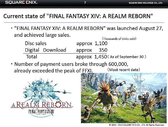 Do 30 września bieżącego roku gra Final Fantasy XIV: A Realm Reborn sprzedała się w liczbie ok. 1,45 mln egzemplarzy. Na ten wynik składa się 1,1 mln pudełkowych kopii i 350 tysięcy cyfrowych wersji. Jest to całkiem dobry wynik biorąc pod uwagę fakt, że tytuł zadebiutował 27 sierpnia na PC i PlayStation 3. Powyższy rezultat udało się więc osiągnąć w nieco ponad miesiąc.