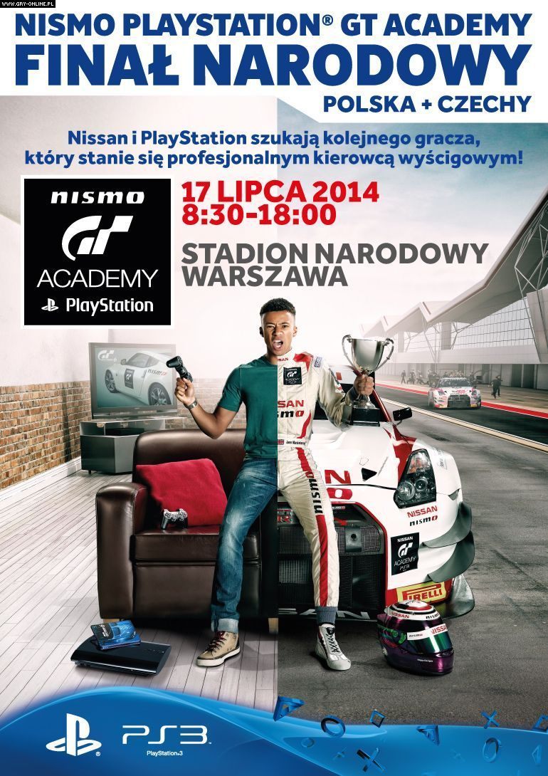 Firma Sony Computer Entertainment Polska poinformowała, że 17 lipca na Stadionie Narodowym w Warszawie odbędzie się Finał Narodowy GT Academy 2014. W rozgrywkach weźmie udział dziewięciu najlepszych zawodników z Polski i tyle samo graczy z Czech. Zostali oni wyłonieni na drodze eliminacji. Pięciu polskich graczy zakwalifikowało się za pośrednictwem PlayStation Network, kolejnych dwóch przeszło rozgrywki na żywo mające miejsce w Warszawie na przełomie maja i czerwca, a pozostali dwaj (spośród dziewięciu najlepszych z tzw. Wyzwania na Facebooku) zostaną wyselekcjonowani jutro w zamkniętych zmaganiach przedfinałowych. Celem Finału Narodowego GT Academy 2014 jest wyłonienie zawodników, którzy będą walczyć w Europejskim Finale na torze Silverstone. W tym roku szansę na kwalifikację mają dwaj kierowcy z Polski.
