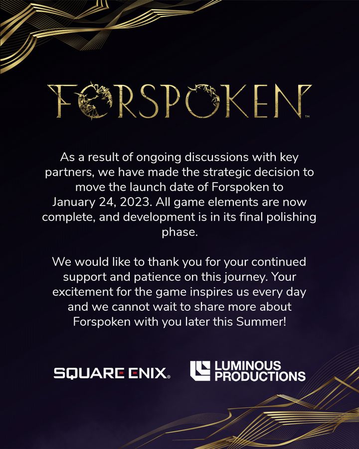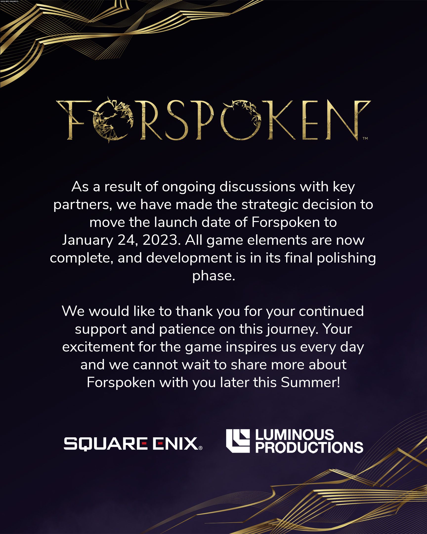 Jak podano w oficjalnym oświadczeniu, decyzja ta została podjęta po rozmowach z kluczowymi partnerami. Twórcy pochwalili się również postępami prac nad grą. Wszystkie elementy, jakie miały znaleźć się w Forspoken zostały ukończone i obecnie tytuł znajduje się w fazie dopracowywania.