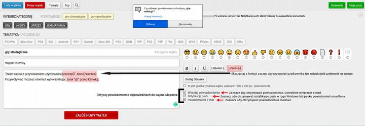 Co zrobić, żeby otrzymywać powiadomienia o tym, że ktoś odpisał mi w wątku lub odpowiedział na posta? Przy zakładaniu wątku lub pisaniu wiadomości musisz zaznaczyć 'Wysyłaj powiadomienia', a następnie wybierać formę informowania o dokonanych akcjach. Powiadomienia mailowe to domyślnie zaznaczona forma powiadomień. Notyfikacje push to informacje wyświetlające się w prawym dolnym rogu ekranu komputera lub na pasku powiadomień urządzenia mobilnego i są domyślnie odznaczone. Przy pierwszym zaznaczeniu 'Wysyłaj..." pojawi Ci się okienko "Czy odbierać powiadomienia od witryny gry-online.pl", zaznacz "Odbieraj". Aby lepiej rozeznać się w nowym interfejsie, rzućcie okiem na poniższy screen.
