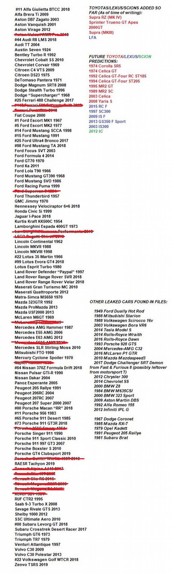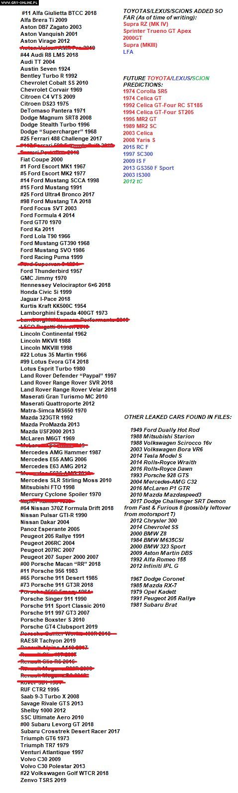 Warto odnotować, że zestawienie jest oparte na informacjach znalezionych w plikach gry i niektóre z samochodów trafiły już do omawianej produkcji (to te, które na powyższym obrazku zostały skreślone). Jednak nadal mamy do czynienia z niepotwierdzonym przeciekiem. Nie da się wykluczyć, że wsparcie dla tytułu Playground Games zakończy się znacznie wcześniej niż spodziewa się autor posta i nie otrzymamy nawet jednej czwartej z wymienionych samochodów.