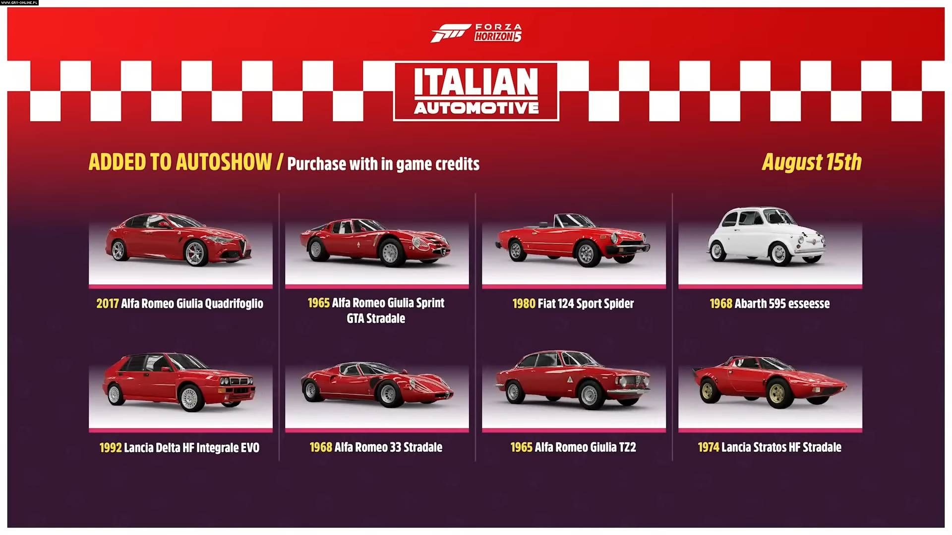 Przełom sierpnia i września upłynie w grze Forza Horizon 5 pod znakiem nowych i starych-nowych samochodów. W Serii 24., zatytułowanej Italian Automotive i rozpoczynającej się w najbliższy czwartek, studio Playground Games nie bawi się w opowieści czy dekorowanie mapy – jutrzejsza aktualizacja ma przede wszystkim poszerzyć park maszyn o zaginione włoskie marki: Alfa Romeo, Lancia, Fiat i Abarth.