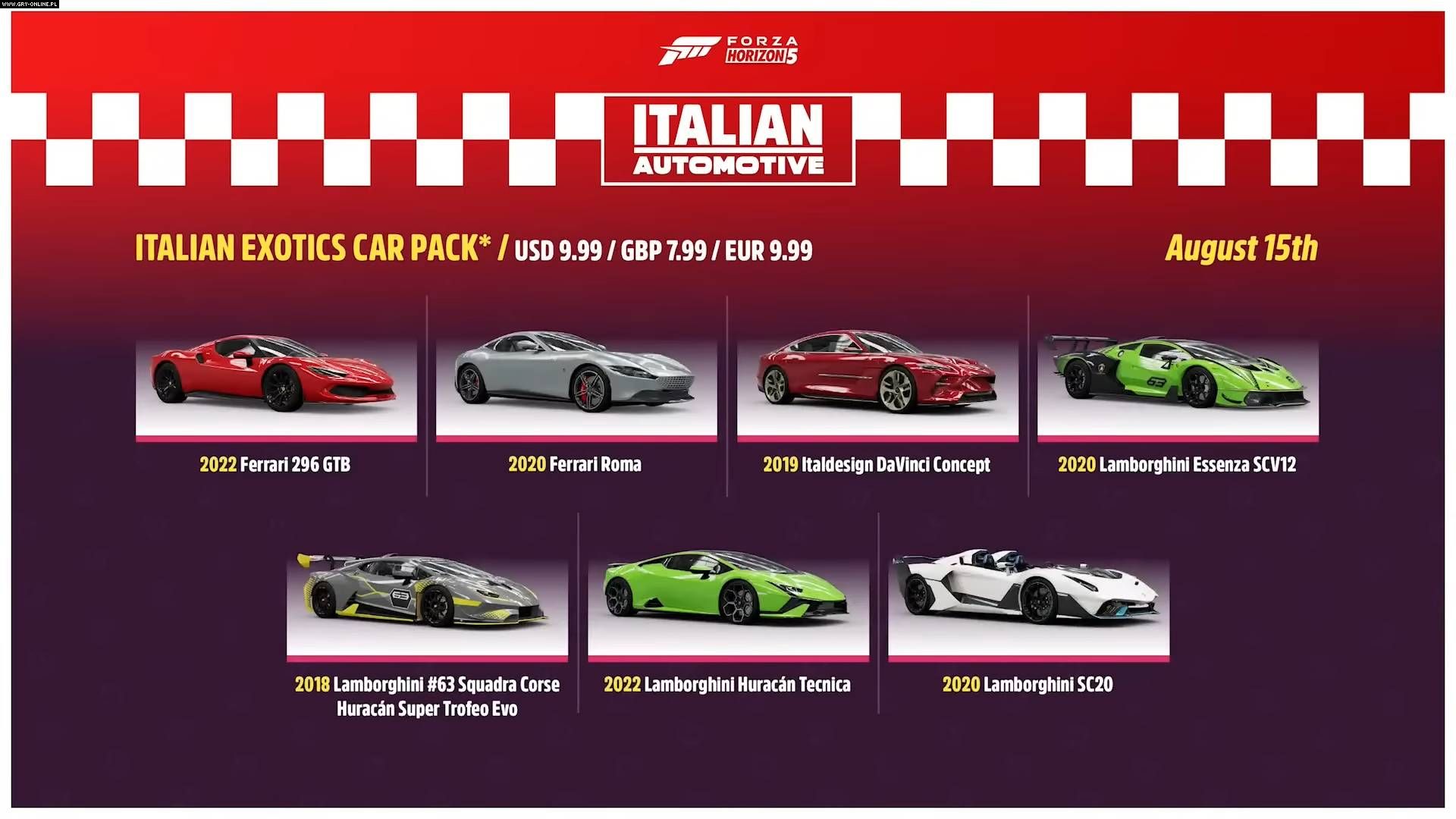 Playground Games kontynuuje dorabianie na zupełnie nowych samochodach i wypuszcza kolejne DLC, zatytułowane Italian Exotics Car Pack. Tym razem dostaniemy w ten sposób siedem aut, a cena podskoczy do 9,99 euro, czyli – w przeliczeniu – najprawdopodobniej 48 zł. Dodatek ukaże się jutro, równolegle z aktualizacją.