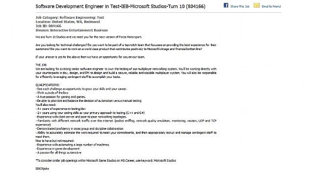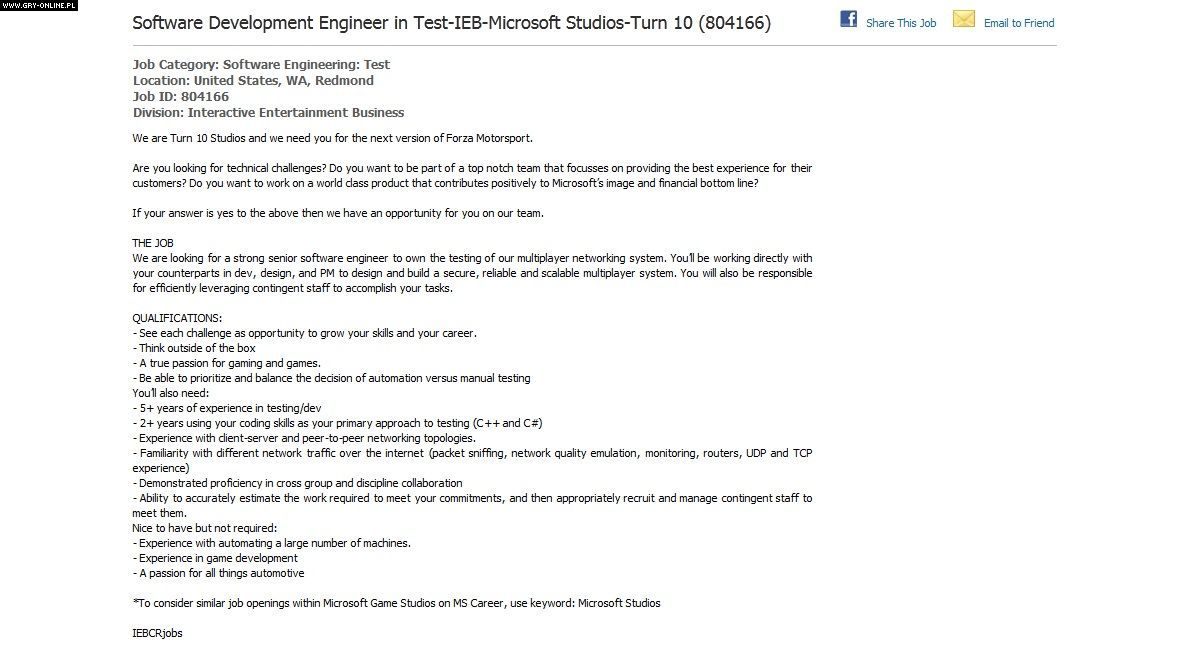 W sieci pojawiło się interesujące ogłoszenie. Firma Microsoft wraz ze studiem Turn 10 (odpowiedzialnym za cykl gier wyścigowych Forza Motorsport) poszukuje pracownika do pomocy w tworzeniu „kolejnej wersji Forza Motorsport”. Chodzi konkretnie o osobę na stanowisko starszego programisty, który ma zająć się trybem wieloosobowym. Oto wspomniane ogłoszenie: