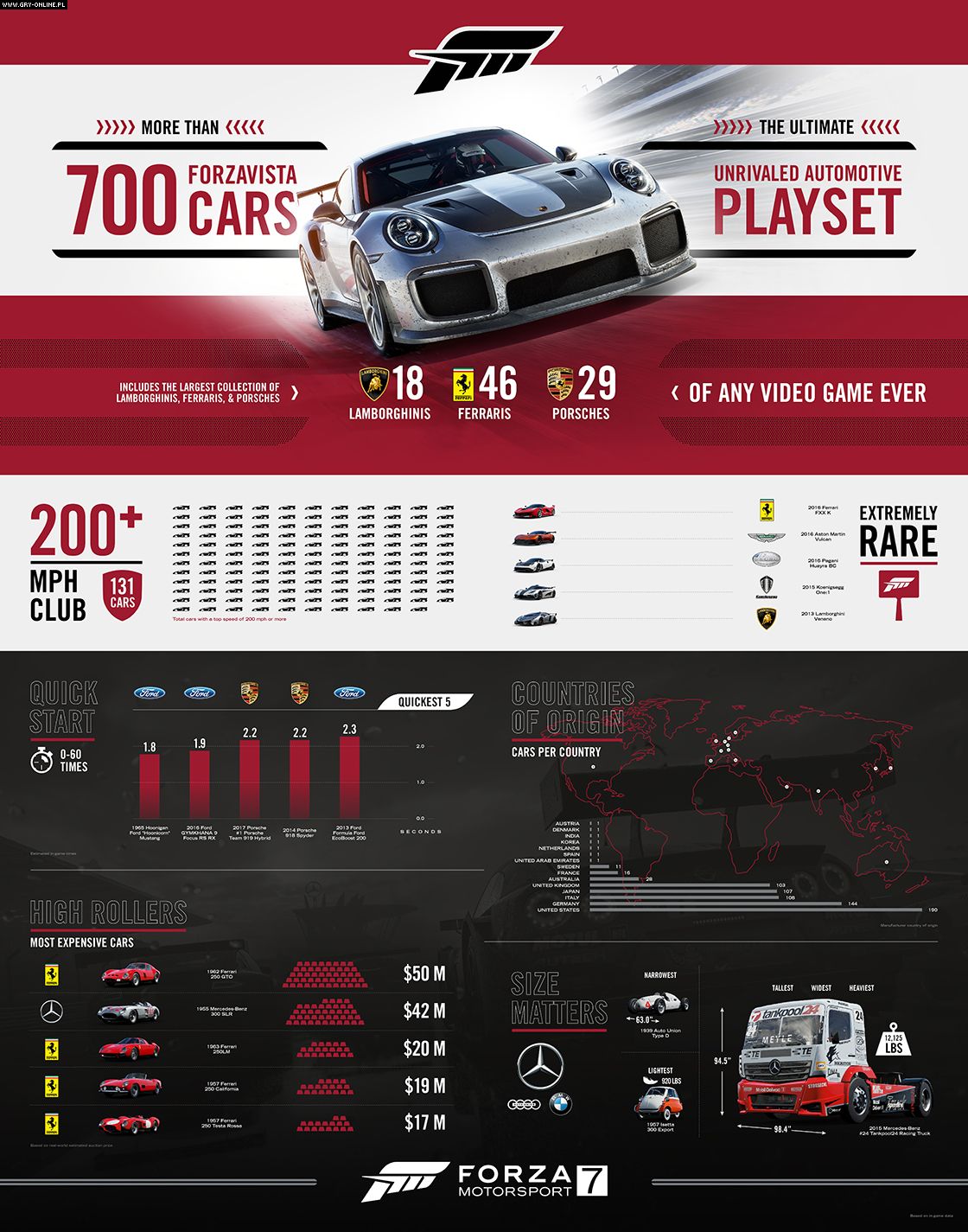 Z okazji skompletowania pełnej listy ponad 700 samochodów, jakie znajdą się w premierowej wersji Forzy Motorsport 7, twórcy przygotowali również specjalną infografikę, przedstawiającą kilka ciekawych statystyk, dotyczących zaprezentowanych pojazdów. Możemy z niej dowiedzieć się m.in. tego, że gra zawierać będzie najwięcej aut marki Ferrari (dokładnie 46) spośród wszystkich produkcji tego typu, 131 wozów osiągnie prędkość ponad 200 mil na godzinę (321 kilometrów na godzinę), a najdroższą w realnym świecie furą, jaka pojawia się w grze, będzie Ferrari 250 GTO, za które przyszłoby nam zapłacić 50 milionów dolarów.
