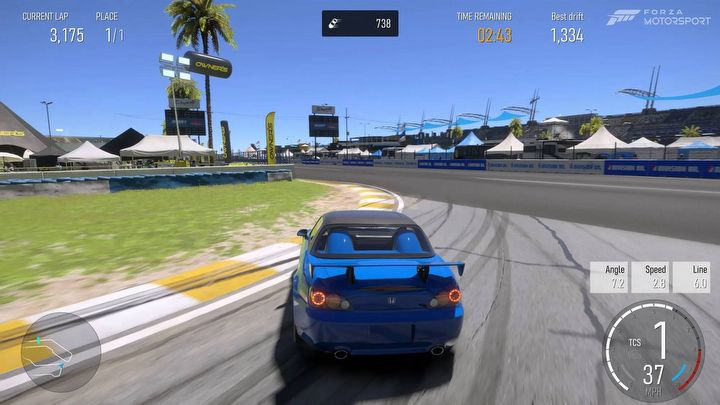 Druga kluczowa atrakcja to nowy tor: Sunset Peninsula. Tym razem Turn 10 przywraca trasę, którą ostatnio widzieliśmy nie w siódmej, lecz w czwartej odsłonie serii – było to jeszcze na Xboksie 360, więc można rzec, że mamy do czynienia z pełnoprawnym remakiem. Sądząc po screenach (przykładowy zamieściłem poniżej), twórcy tchnęli sporo życia w tę zdominowaną przez beton lokację, imitującą sławne amerykańskie tory wyścigowe o owalnym kształcie (choć jest tu również rozbudowana wewnętrzna sekcja – łącznie otrzymujemy tę trasę w pięciu wariantach).