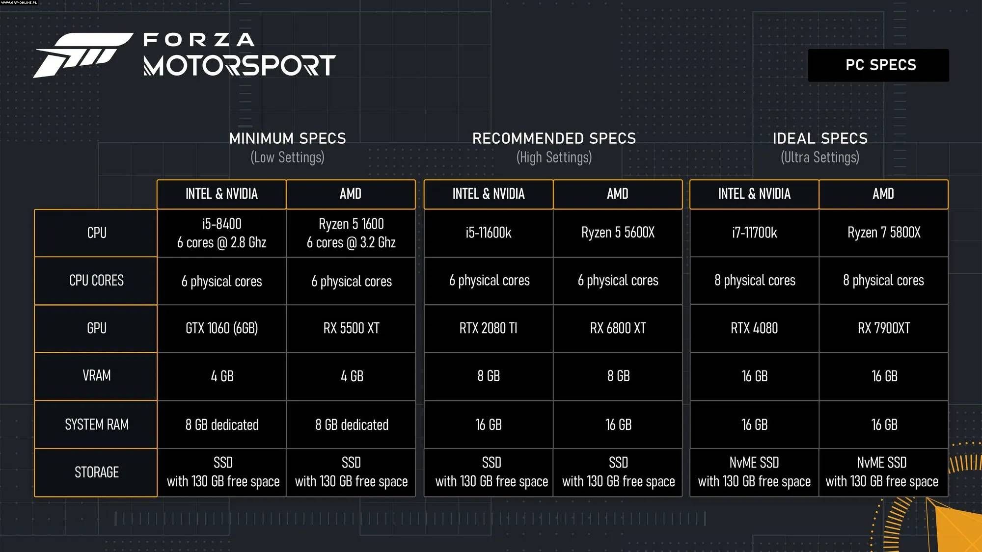 Jak widać, specyfikacja jest obiecująco niewygórowana jak na „next-genową” jakość grafiki gry. Ponadto studio Turn 10 zdradziło, że pecetowa wersja Forzy Motorsport będzie wspierać rozdzielczość powyżej 4K, a także technologie pokroju DLSS 2.2 i FSR 2.2. Podano też pełną – dość długą – listę wspieranych kierownic.