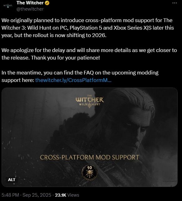 Omawiana funkcja ma zostać udostępniona dopiero w 2026 roku. Nie wiemy, kiedy dokładnie to nastąpi, ale deweloperzy podadzą więcej informacji na ten temat bliżej premiery. Pierwotnie multiplatformowa obsługa modów miała trafić do Wiedźmina 3 w tym roku.