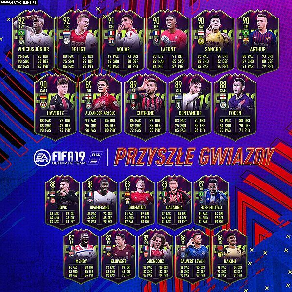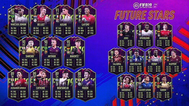 Wydarzenie będzie trwało przez tydzień (rozpoczęło się w piątek o godzinie 19:00), a wszystkie karty będą dostępne w paczkach. Podczas trwania eventu sześciu kolejnych zawodników będzie do zdobycia w Wyzwaniach Budowania Składu. Naturalnie, jeżeli nie uda Wam się zdobyć upragnionych kart w czasie, w którym dostępne są w paczkach, będziecie mogli kupić je na rynku transferowym. Warto jednak podkreślić, że nie będą one należały do najtańszych... Poniżej możecie zobaczyć wszystkich zawodników, którzy znaleźli się w długim 21-osobowym składzie Future Stars.