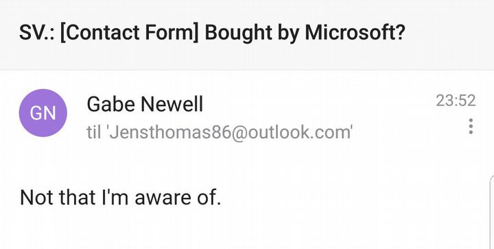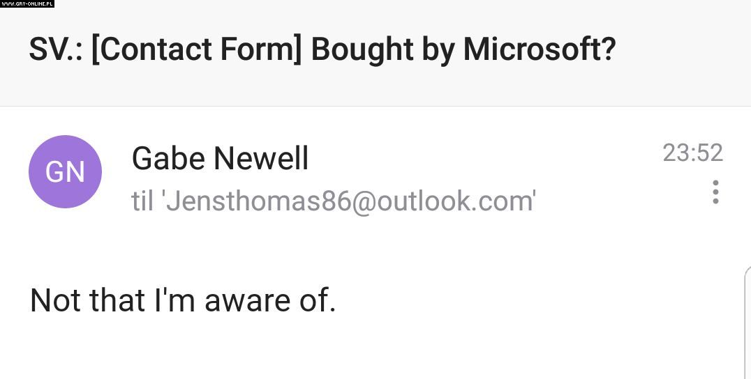 Na początku tego tygodnia informowaliśmy o plotkach dotyczących zakupowych planów korporacji Microsoft, które jako pierwsze pojawiły się w serwisie Polygon. Według nich, amerykański gigant ma potencjalnie rozglądać się za możliwością nabycia Electronic Arts, studia autorów przebojowego Playerunknown's Battlegrounds, a także firmy Valve. Największe wątpliwości wśród graczy wzbudziła oczywiście wieść o nabyciu właścicieli platformy Steam. Perspektywa ta wydaje się wielce nieprawdopodobna, ale wzbudziła duże zainteresowanie graczy i czytelników serwisów informacyjnych. Na tyle, że zasypali oni Gabe'a Newella, szefa Valve, listami z pytaniami dotyczącymi potencjalnego przejęcia jego spółki. Jeden z użytkowników forum ResetERA opublikował zdecydowaną odpowiedź jaką dostał. Newell zdawkowo stwierdził w niej, że „Nie wie nic o żadnych planach sprzedaży”.