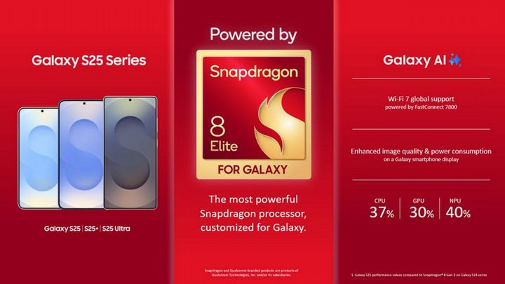 Galaxy S25 napędza zupełnie nowy procesor Snapdragon 8 Elite for Galaxy. Procesor jest wydajniejszy od wykorzystywanego w smartfonach S24 Snapdragona 8 Gen 3 o 37%. Ponadto, nowy chipset gwarantuje wydajniejszą o 40% jednostkę przetwarzania neuronowego (NPU) oraz sprawniejsze o 30% GPU. Usprawnienia mogą znacząco usprawnić obsługę ray tracingu w grach mobilnych. Dodatkowo ulepszono aspekt energooszczędności, co powinno wydłużyć czas pracy na baterii.