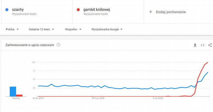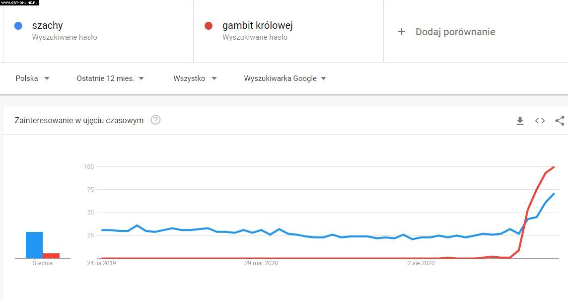 Te pokazują bowiem ciekawą zależność - mniej więcej od momentu premiery nowego serialu Netflixa mocno zwiększyła się w USA popularność dwóch fraz: „Queen’s Gambit” (co nie jest raczej zaskoczeniem) oraz „learn chess”. Analogicznie do statystyk amerykańskich sprawdziliśmy więc sytuację w Polsce – i w tym przypadku tytuł „Gambit królowej” jest wyszukiwany równie często, co „szachy”. Z danymi zapoznacie się na poniższych obrazkach.