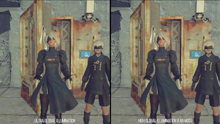 Sporo graficznych problemów Automaty – nie licząc obsługi HDR i możliwości uruchomienia gry bez czarnych pasków na górze i dole ekranu – wciąż jest w grze obecnych. Odbijanie się światła na obiektach (tzw. globalne oświetlenie) dalej nie działa prawidłowo (porównanie macie na grafice poniżej), podobnie okluzja otoczenia (która jest nawet gorsza niż na Steamie), a gra ma problemy z utrzymaniem stałych 60 klatek na sekundę. Co istotne, usterki te eliminował mod FAR. Trudno więc uznać, że NieR: Automata wreszcie dostał port najwyższej jakości, na jaki niewątpliwie zasługuje.