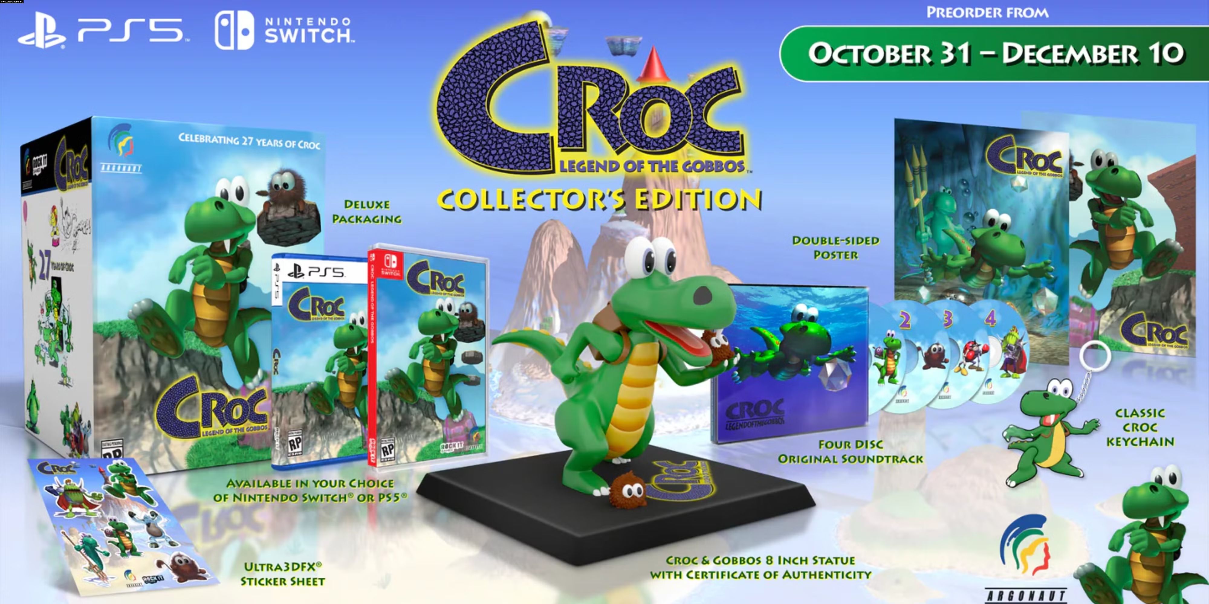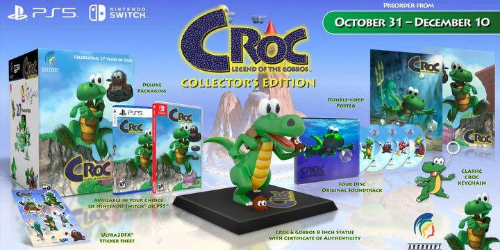 Studio Argonaut Games potwierdziło grudniowe okno premiery Croc: Legend of the Gobbos Remaster, zastrzegając jednak, że jeśli gra nie będzie w pełni gotowa, może zaliczyć kilkutygodniową obsuwę. Ponadto deweloper rozpoczął przedsprzedaż fizycznej wersji produkcji na PS5 i Switcha (39,99 dolara, tj. ok. 160 zł) praz edycji kolekcjonerskiej (129,99 dolara, tj. ok. 520 zł), która została przedstawiona na poniższej grafice. W obu przypadkach zamówienia można składać do 10 grudnia. Warto dodać, że cyfrowa wersja gry będzie nieco tańsza niż fizyczna (29,99 dolara, tj. ok. 120 zł).
