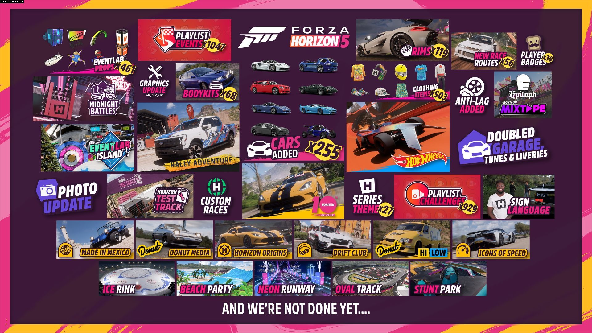 Warto jeszcze wspomnieć, że przedwczoraj Forza Horizon 5 skończyła dwa lata. Twórcy podsumowali wszystko, co zostało dodane do gry w tym czasie, na całkiem okazałej infografice (poniżej).