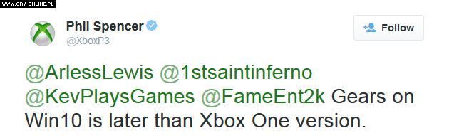 Przedstawiciel Microsoftu potwierdził, że gra Gears of War: Ultimate Edition, która jest ulepszoną reedycją pierwszej części cyklu Gears of War, pojawi się na komputerach PC dopiero jakiś czas po sierpniowej premierze na Xboksie One. Tytuł będzie współpracował jedynie z pecetami wyposażonymi w system Windows 10.