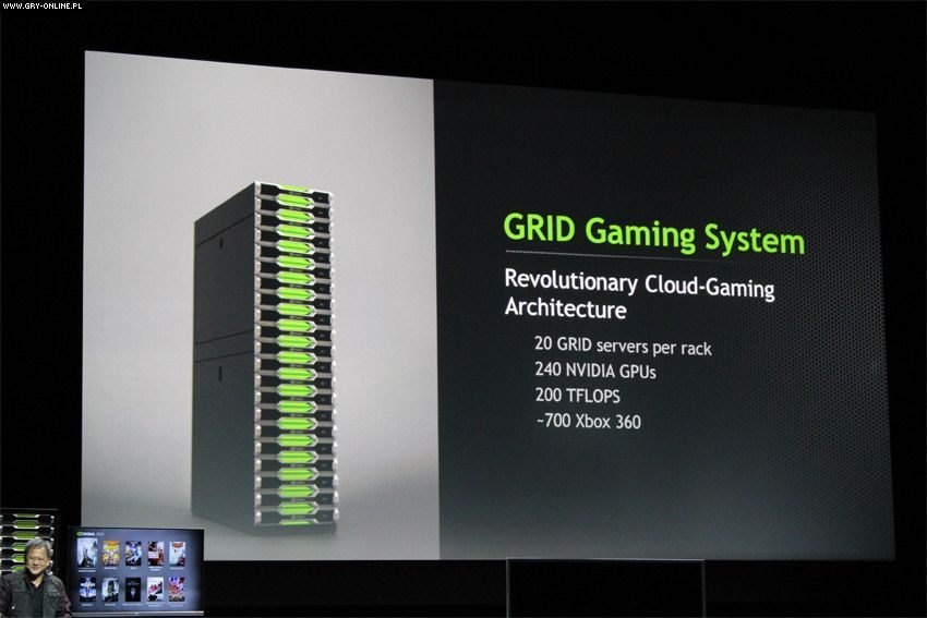 Na konferencji poprzedzającej targi CES firma Nvidia zapowiedziała kilka nowości. Jedną z nich jest Nvidia GRID – specjalny system serwerowy do streamowania gier oparty na chipsecie GeForce GRID. Ma on o wiele większą moc obliczeniową od obecnego sprzętu używanego do grania w chmurze. Nvidia porównuje jego możliwości do 700 Xboksów 360. Jedno „żebro” Nvidia GRID składa się z 240 procesorów graficznych i osiąga 200 teraflopów. Każde z nich stanowi 20 serwerów, obsługujących po 24 aktywnych użytkowników. Podczas prezentacji Nvidia pokazała możliwości GRID-a uruchamiając za jego pośrednictwem Trine 2 na wielu komputerach i urządzeniach działających na Androidzie jednocześnie.